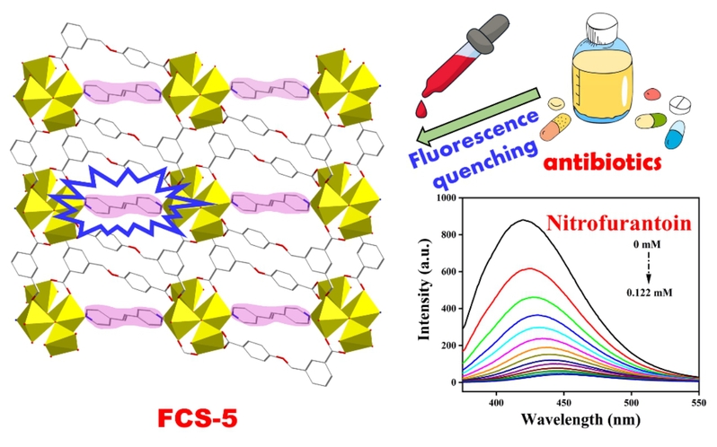 该论文通过辅助配体调控机制制备了两种锌(II)基金属有机框架材料FCS-4和FCS-5,并将其用作硝基呋喃类抗生素的超灵敏检测。研究发现,吡啶基辅助配体的不同柔韧特性可导致不同的拓扑结构和荧光性能。在抗生素的超灵敏检测中,FCS-5对呋喃西林和呋喃妥因的检测灵敏度更高,其检测限分别可达0.22和0.15 ppm。进一步的机理研究表明,光诱导电子转移在硝基呋喃类抗生素的超灵敏检测中起关键作用。该项工作为新型金属有机框架材料基化学传感器的设计与构建提供了新的思路。