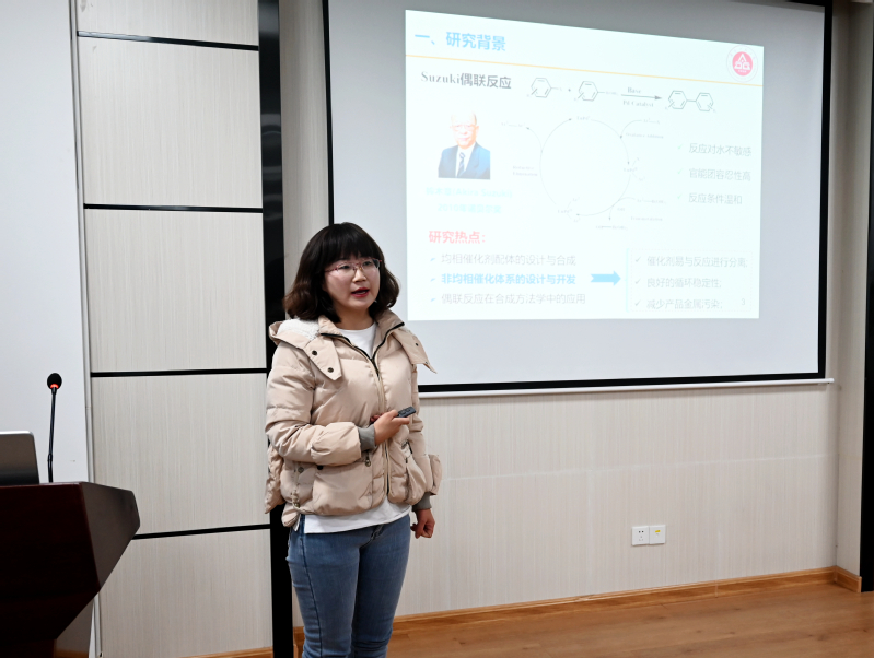 毕佳俊博士毕业于华中科技大学化学与化工公司,主要从事多相催化剂的制备及其应用方面的研究工作。她报告题目为“含N聚合物负载金属催化剂的制备及应用”,报告中分享了她在不同共轭程度以及不同活性中心的催化剂的形貌结构以及催化性能的研究成果,利用X射线衍射仪(XRD)、扫描电镜(SEM)、场发射扫描电镜(TEM)、固体核磁碳谱(13C CP/MAS NMR)和X射线光电子能谱(XPS)等多种表征方法对其物相结构、微观形貌、结构和金属价态进行表征,探讨了上述催化剂在C-C偶联、C-H卤化、酚类降解等反应中的催化活性。