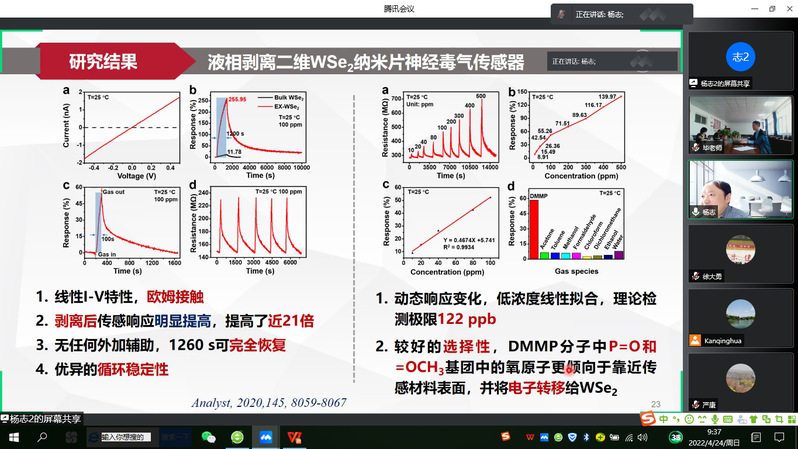 报告会上,杨志教授做了题为“面向环境气体检测的纳米敏感材料与传感器件”报告。杨教授详细介绍了气体传感器在环境监测、公共安全和智慧医疗等领域的应用,阐述了敏感材料的增感设计及多效应传感器阵列的系统集成研究领域的关键科学问题。并与大家分享了其在包括“类神经元”网络气体传感器件模型、活性位点与气体分子的室温响应机制以及室温高灵敏便携式气体传感系统的构筑等方面的研究成果。