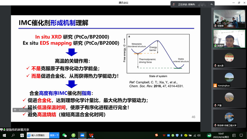 梁海伟教授围绕“原子有序合金氢燃料电池催化剂”的制备,分享了其课题组依据催化剂烧结热力学和动力学等基本原理,发展了两种碳载金属催化剂高温抗烧结方法,依据此抗烧结方法以及IMCs形成热力学和动力学基本原理,发展了两种小尺寸原子有序IMCs催化剂合成方法学,并以此构建了庞大、完备的IMCs催化剂材料库。其课题组同时发现IMCs电催化氧还原活性与表面压缩应变在很宽的范围内存在正关联性,筛选出的若干高活性催化剂表现出卓越的低铂氢燃料电池性能。