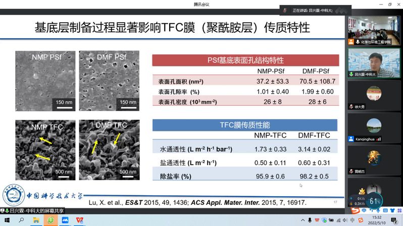 吕兴霖教授做了题为“高性能海水淡化膜材料的尝试与探索——从微界面表征到膜材料调控”的报告。吕教授以海水淡化膜材料的发展历程为主线,一一做了阐述。介绍了第一代海水淡化膜膜醋酸纤维素(CTA)膜的产生,通过改性,研究其物相及动力学过程,进行调控和优化;对于第二代聚酰胺(TFC)膜,详细阐述了基底层制备过程对TFC膜传质特性的显著影响,及其表征的困难和解决方法;展望了潜在新型的海水淡化膜材料,分享其课题组开展的二维纳米片材料膜的研究进展和成果。