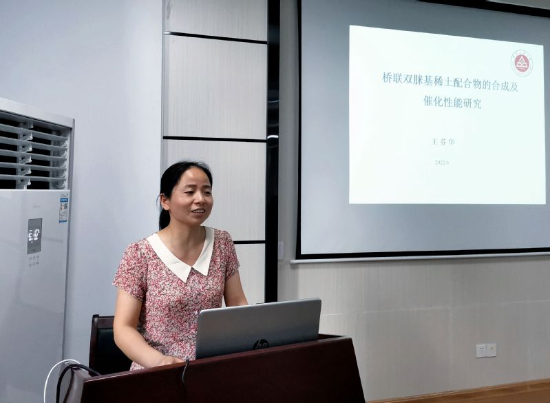 王芬华副教授研究方向是金属有机化学,她的报告题目为“桥联双脒基稀土配合物的合成及催化性能的研究”。王老师为现场师生详细介绍了桥联双脒基稀土配合物的研究背景、意义、课题设计思路及研究进展,分享了其近年来的具体研究成果,包括桥联双脒基化合物的设计合成,桥联双脒基稀土胺基配合物的合成及其在催化己内酯和丙交酯开环聚合、催化Strecker反应的应用,以及研究过程中遇到的问题和解决思路。