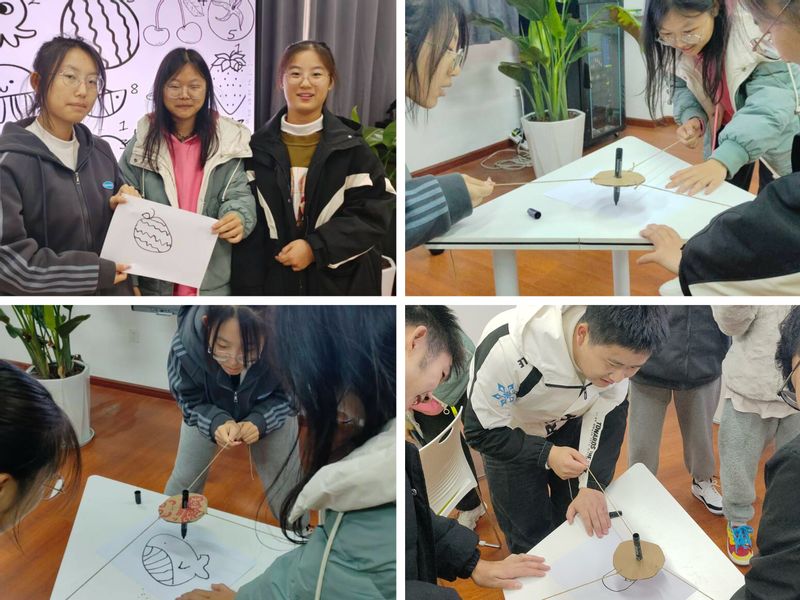三人一组,选择要挑战的临摹画,用系上绳子的马克笔进行绘画,每人抓住绳子末端,手不能碰笔,共同临摹一幅简笔画。以绳执笔,新颖的绘画方式吸引同学们热情参与,大家相互配合,一起努力,让面前不听使唤的笔在绳子的牵引下画出可爱的图案,既考验了同学们的合作协调能力,也挑战了大家的默契程度。本次活动共评选出一等奖1个,二等奖2个,三等奖3个。