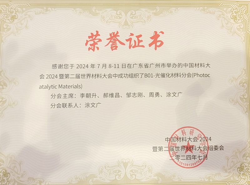 本届中国材料大会积极邀请欧洲、亚洲等国家和地区的专家学者进行合作交流,设置92个热点领域分会场,覆盖到当前新材料研究的各个前沿领域,2.5万余名材料科技工作者和企业代表参加了本次大会。77779193永利周勇教授担任光催化材料分会主席之一,光催化材料分会场汇聚了来自世界各地多位专家学者和行业人士,共同探讨光催化材料在光催化分解水制氢、光电催化分解水制氢、光催化降解污染物、光催化还原CO2、光催化固氮、光催化有机合成以及光催化机理研究等方面的最新研究进展和创新应用。