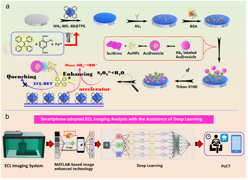 团队成员通过在金属-有机框架内原位封装聚集诱导发光(AIE)分子四苯基乙烯,构建了一种新型电化学发光传感体系。基于金属-有机框架的限域催化增强效应,实现原位催化生成活性物质,并与AIE分子发生直接相互作用,提高活性物质的利用率,从而显著增强AIE分子的发光效率。理论计算和原位电化学电子顺磁共振波谱分析表明,纳米限制空间可显著改变反应体系的活化能垒,提高活性物质SO4·−和OH·−的生成效率,从而提升发光效率。以此为基础,研究团队通过MATLAB介导的图像增强技术和深度学习算法,利用智能手机构筑了便携式发光成像分析系统,实现了对心肌肌钙蛋白I(cTnI)的精准和智能分析。该研究提出了一种通过纳米限制催化提高局域活性物质浓度的高效策略,构建的便携式聚集诱导电化学发光成像系统为疾病标志物的高灵敏检测提供了一种便捷的筛查分析新方法。