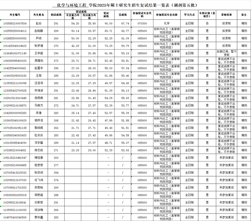 2025年硕士研究生招生复试结果一览表(调剂第五批)