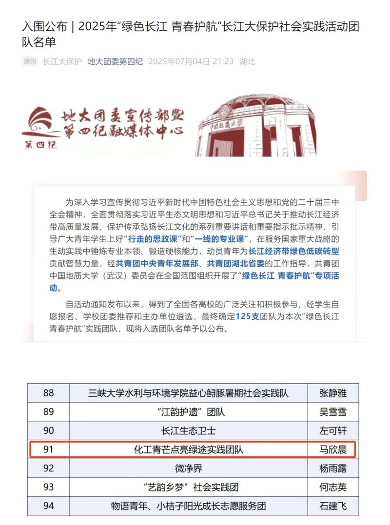 近日,由共青团中央青年发展部、共青团湖北省委的工作指导,共青团中国地质大学(武汉)委员会公布了2025年“绿色长江 青春护航”长江大保护社会实践活动团队名单,公司77779193永利“化工青芒,点亮绿途”社会实践团队成功入选。