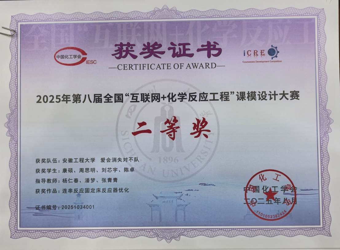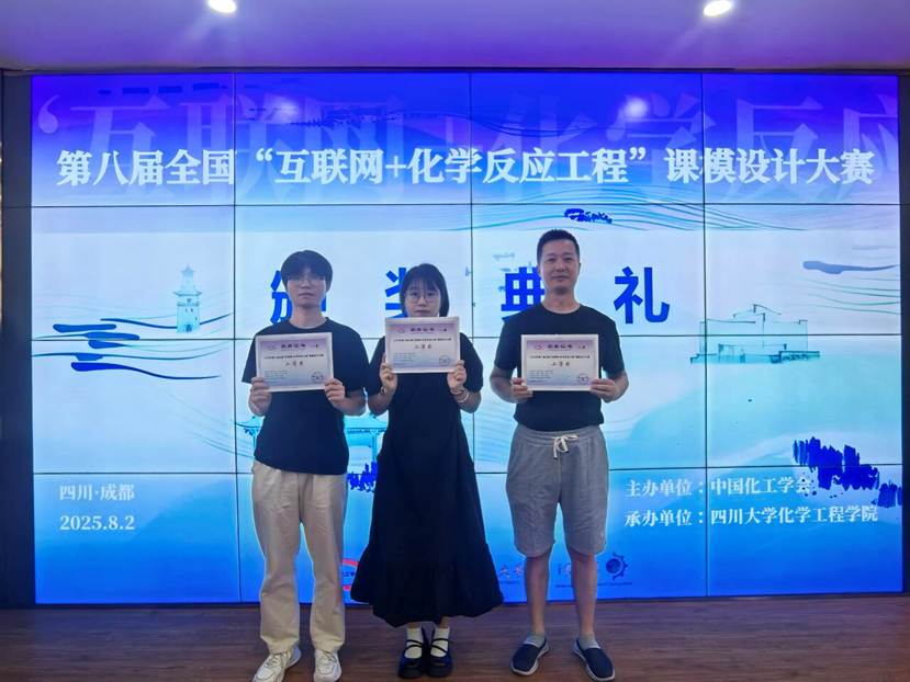 由中国化工学会主办,四川大学承办的第八届全国“互联网+化学反应工程”课模设计大赛于2025年8月2日在四川大学展开。公司首次组队参加该赛事,经过激烈角逐,公司设计提交的《连串反应固定床反应器优化》作品荣获国家级二等奖(指导老师为杨仁春、潘梦、张青青)。